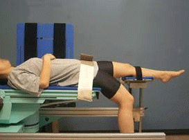 (1) 被験者に計測対象側の下腿が計測台から垂れるように計測台に仰向けで寝てもらい、骨盤をベルトで固定する。