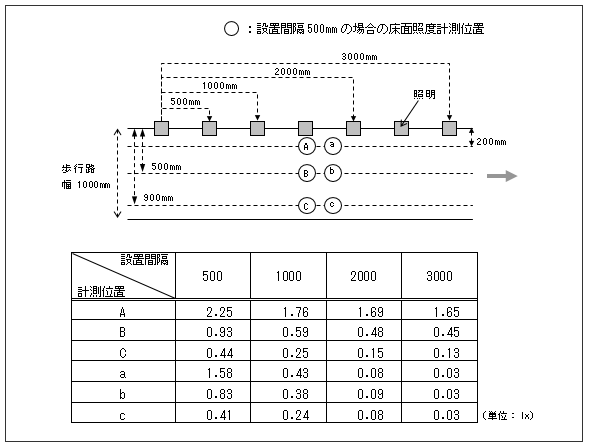 10mの歩行路のほぼ中央(4~5m地点)で照度計を用いて測定した。